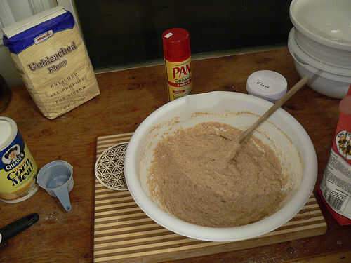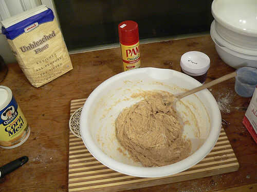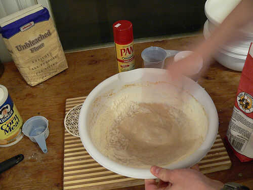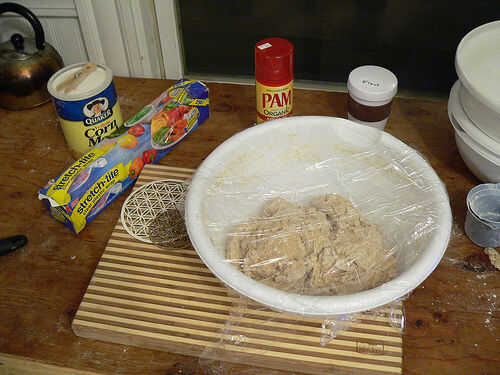 Punta pro: Después de mezclar, dejar la masa durante unos 10 minutos en un recipiente cubierto. Esto es una manera perezosa autólicese la masa que hace más fácil trabajar con al amasado. Se supone que autólicese antes de añadir la levadura y otros ingredientes más allá de la harina y el agua, pero he encontrado este método perezoso fructífera. Recientemente aprendí este truco que puede ayudar a retener la humedad y requiere menos harina añadir durante el proceso de amasado.