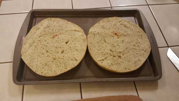 Simplemente desenvolver el pan y tajada con cuidado por el medio para separar la parte superior e inferior. Pensar como hacer un bollo de hamburguesa enorme. Una vez que se dividen las mitades, se puede poner en una cacerola con la proyección del borde.