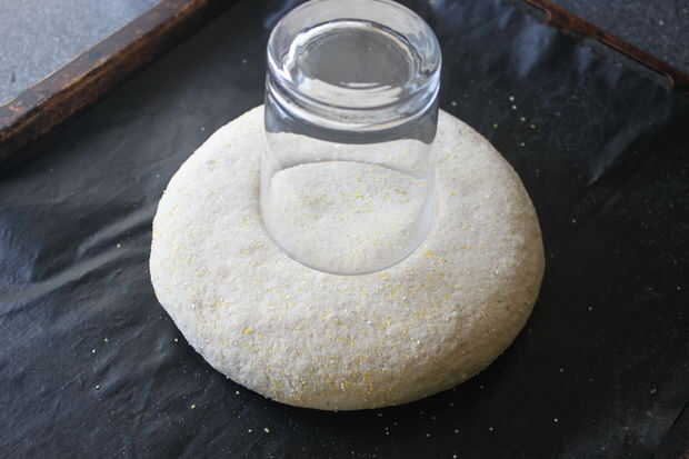Pongan la pasta ahora en un papel para hornear sobre la bandeja para hornear y aplanar un poco. Poner un vaso de agua en el medio y presione ligeramente la masa.