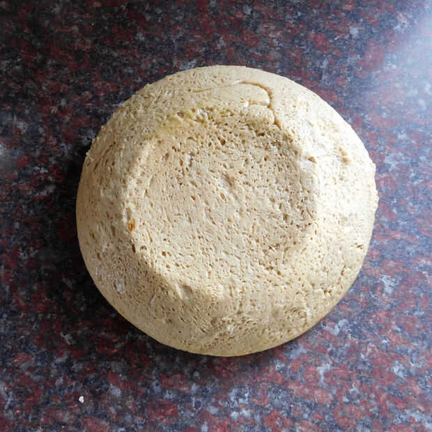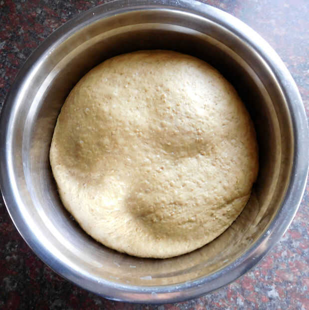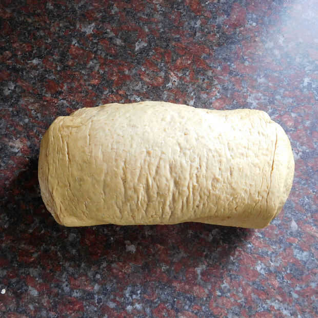 Masa se haya doblado en tamaño una vez hacia fuera sobre una superficie de trabajo limpia, tratando de no lo molestar a mucho. Doblar suavemente la masa en tercios en forma de pan.