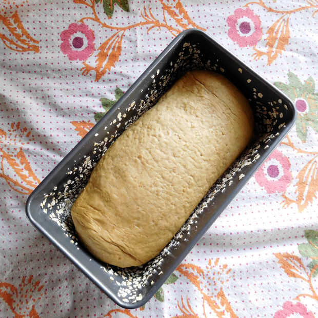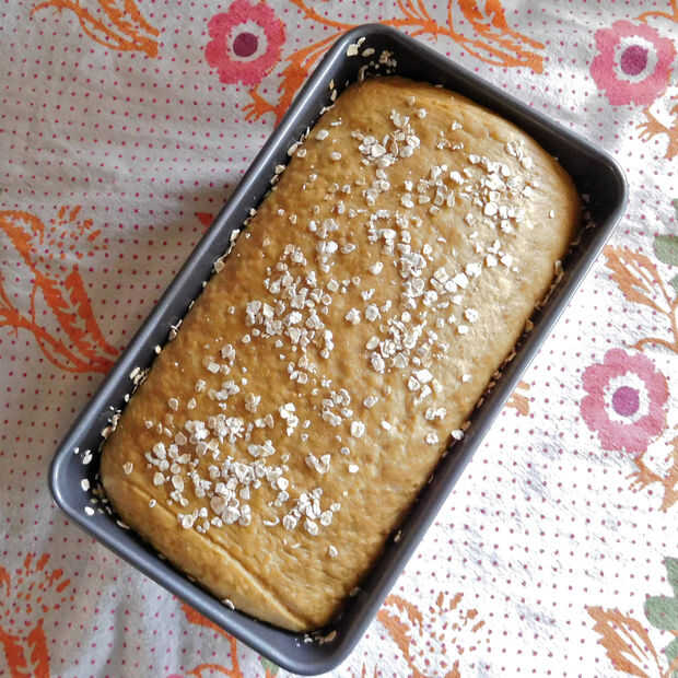 * Opcional - rocía la parte superior de la masa ligeramente con aceite de oliva y espolvorear con 2 cucharadas de avena. Encontré que todos los de la avena se cayeron así que no creo que este paso era necesario. Creo que tendrían que ser celebrada con huevo pero hizo el pan bastante cuando por primera vez fuera del horno.