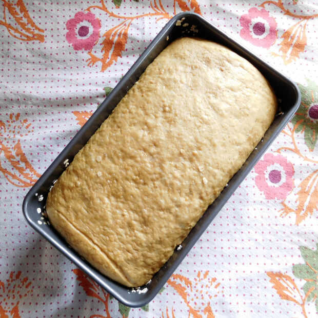 Colocar en el molde que preparaste. Prueba otra vez hasta que la masa había subido a la parte superior o por encima de la bandeja de pan.