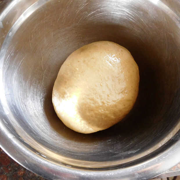 Vierta 1 cucharadita de aceite de oliva en el fondo de un recipiente grande y coloque la masa en el recipiente. Enrolle la masa para cubrir totalmente con aceite.