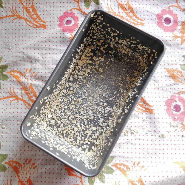 Mientras que la masa es impermeabilización, capa generosamente un molde con mantequilla y espolvorear con avena rápida. Ponga a un lado.