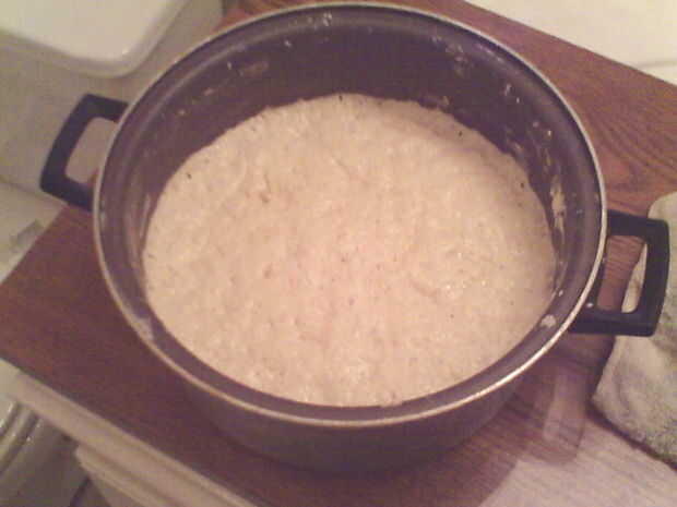 Suavemente saque la masa y doblar un par de veces sin desinflar la masa. Ahora vuelva a colocar la masa en el vaso aumentando durante dos horas más. Ser paciente ya que es la pena.