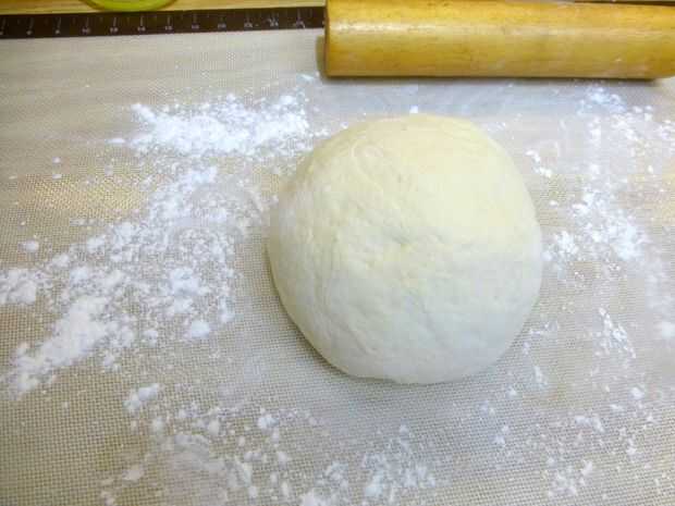 Aquí le damos una buena bola de masa hecha con harina de 22 oz, 13 oz de agua, 1 cucharada de levadura, 1 cucharadita de sal. Quiero 60% hidratación. Necesitamos mucho de la estructura del gluten, harina de pan es mejor. Amasar con el gancho para media hora más o menos. Cubra el tazón para levantarse y prepararse.
