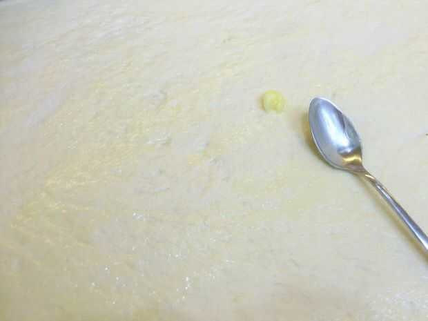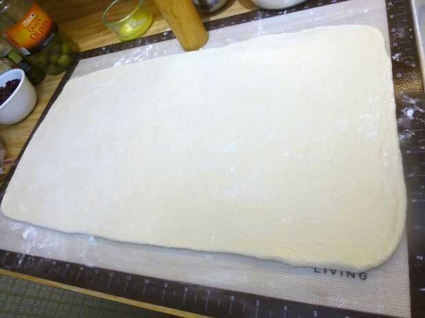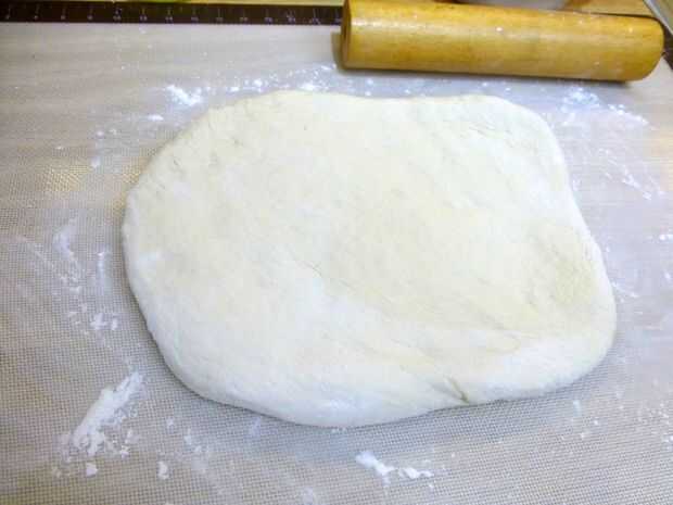 Cuando cede, ruedo en una hoja hasta de forma de 2:1. Mi objetivo es 24 por 12 pulgadas, porque uso un horno pequeño. Generalmente se hace más amplia.