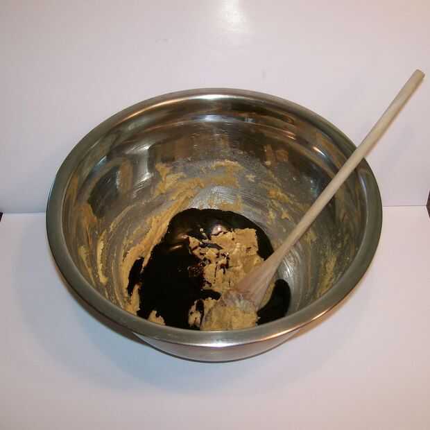 En un gran bowl crema mantequilla y azúcar morena. (Se puede sustituir la azúcar marrón oscuro Si quieres la masa marrón muy oscuro - no cree que es necesario si no lo tienes en mano) Agregar la melaza y el huevo. Mezclar bien.
