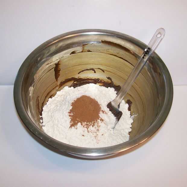 Tamice la harina, bicarbonato de sodio y calabaza pastel de especias juntos y añadir para humedecer la mezcla.