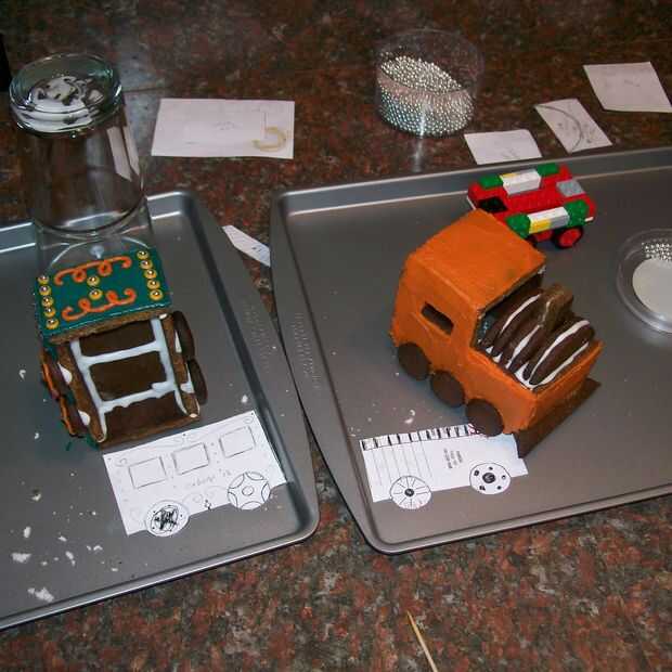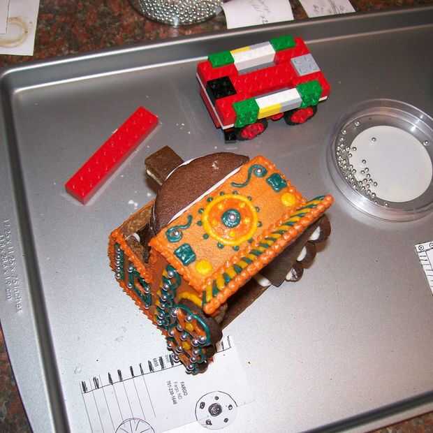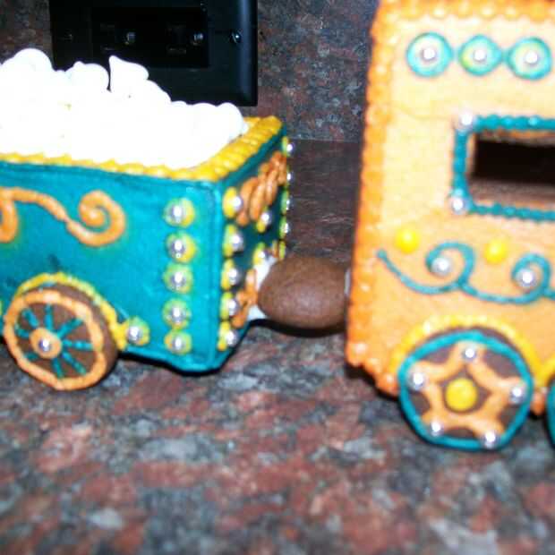 Una vez que los otros coches están decorados utilice las restantes piezas de pan de jengibre para enganchar los vagones junto con glaseado real.