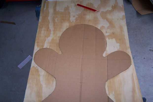 -Colocar la plantilla de Gman cartón sobre el lado liso de la madera contrachapada.