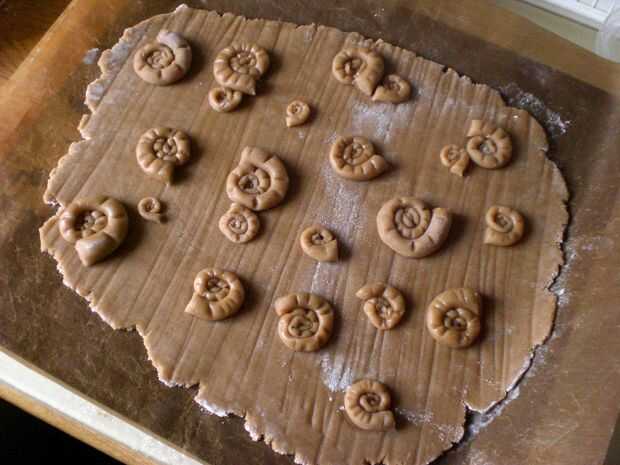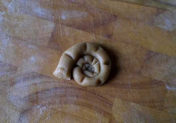 Comenzando en el extremo fino, cuidadosamente encima de la masa de la bobina en forma de espiral y luego cortar la Plaza de extremo grueso para hacer la forma de una cáscara de la amonita