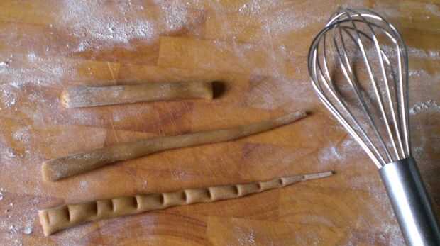 Tomar pequeños trozos de masa y hacerlas rodar en conos largos, cónicos.