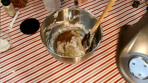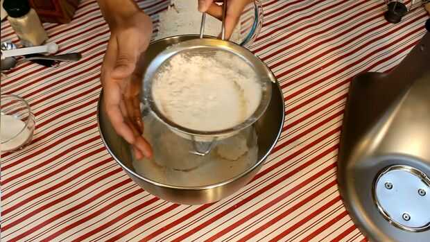 Tamizar los ingredientes secos a la mezcla de huevo y doble hasta que se forme una masa fundida como que globos abajo cuando su saque su espátula de la taza. El bateador debe fluir lentamente a la forma en la forma del recipiente (ver video para la representación visual).