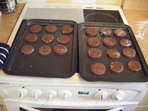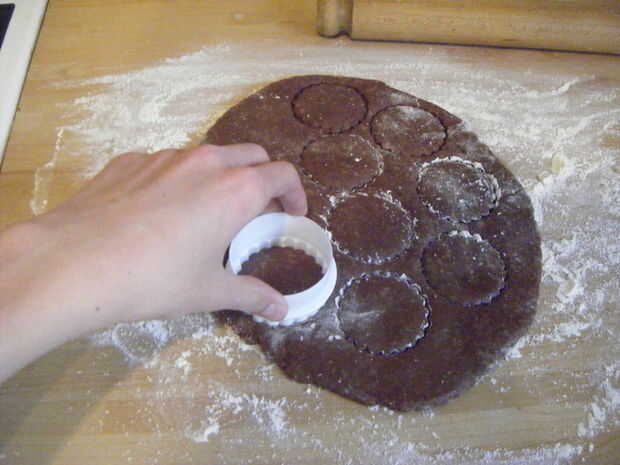Cubren una superficie de trabajo limpia con harina y enrolle la masa a unos 10mm de espesor con un palote, asegurando que la masa está cubierta generosamente con harina para evitar que se pegue. Usando un cortador de galletas espolvoreada con harina, cortar las galletas, volver a rodar la masa libre hasta que todo se utiliza. Extienda uniformemente las galletas en las bandejas para hornear engrasadas y poner en el horno precalentado por 6-7 minutos. Rotar las bandejas para asegurar una cocción uniforme y ponerse de nuevo en el horno durante otros 6-7 minutos.