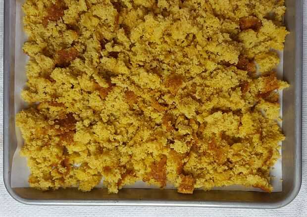 Precalentar el horno a 250° F. Grueso se desmoronan el pan de maíz. Extiende las piezas en una bandeja para hornear grande. Tostadas en el horno, sacudiendo de vez en cuando, hasta muy seco, aproximadamente 1 hora. Luego aumentar la temperatura del horno a 375° F.