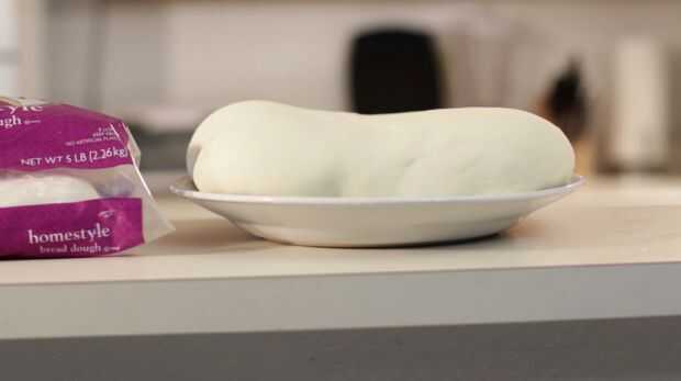Sacar la masa de pan congelado de congelador y dejarlo descongelar y subida. (siga las instrucciones en el paquete) Ahora, vamos a precalentar el horno a 350 grados F.