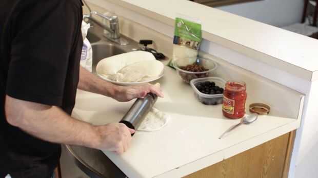 Ahora tomamos cerca de un tercio de la barra de pan de masa de pan y colocar en un contador que ha sido ligeramente espolvoreado con harina. Luego estirar la masa bonita y fina con un rodillo.