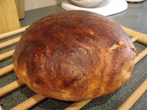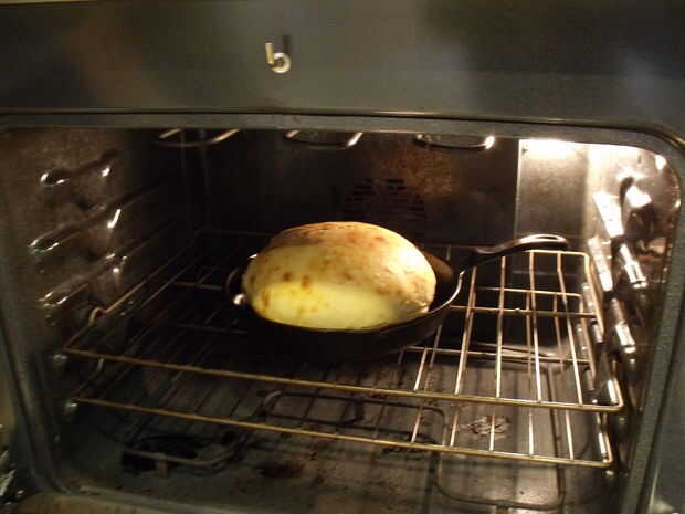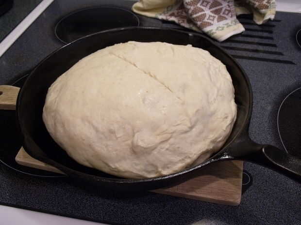 Precalentar el horno a 500 grados Fahrenheit con una bandeja vacía arrabio. Una vez precalentado poner la masa en la sartén caliente durante 15 minutos. Después de 15 minutos reducir la temperatura a 400 o 450 grados Fahrenheit y dejar durante 30 minutos.