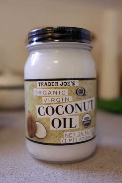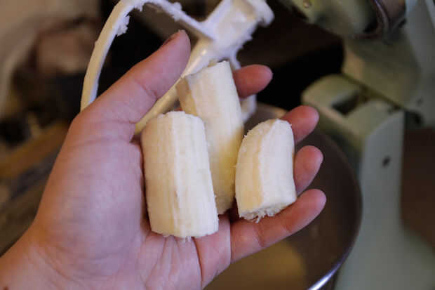 Después de puré 3 plátanos y les raspa en el bol, añadí una cucharada pequeña de aceite de coco, en él es de estado sólido. Mezcló otra vez con paleta hasta que la mezcla parecía lisa.