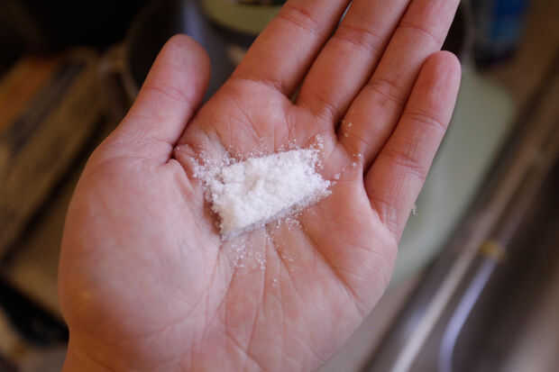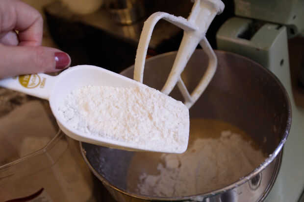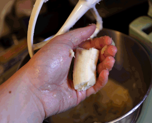 Después mezcla consistente y suave, pasa la paleta por el gancho para masa en la batidora con base.