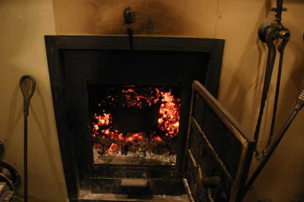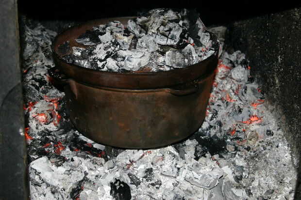 Quiere esperar hasta que los trozos de carbón están muy calientes y la cámara de combustión de la leña se calienta totalmente. Los carbones de nivel y la olla de hierro fundido en las brasas. Coloque el carbón encima de la tapa de la olla para proporcionar calor de todos los lados.