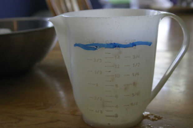Tome un momento para reponer su motor de arranque ahora mismo. Si usted está haciendo una tanda de masa fermentada y el uso de una taza del arrancador, llenar con agua de 1/2 c. y 1 c. harina. Si estás haciendo dos lotes a la vez (que es lo que suelo hacer) a llenar el motor de arranque con 1 agua y 2 c. harina. La proporción de agua a la harina suele ser de 1 parte de agua a 2 partes harina. Si el arranque es demasiado grueso o demasiado fino, se puede ajustar de acuerdo.
