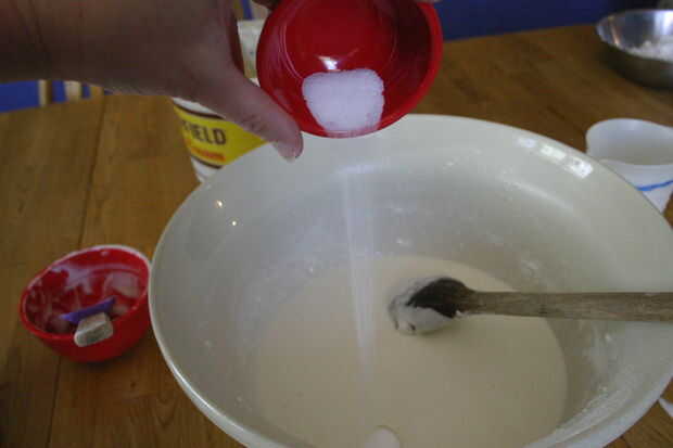 Añade la tercera taza de agua, y mientras sigues revolviendo la mezcla, añade la sal y mezcla bien. La sal se ralentizará la fermentación. Esto es bueno. Cuanto más tiempo la masa tarde en subir, el más amargo el pan será. Si no te sientes cómodo con esta cantidad de sal, puedes reducirla. Pero, afectará al sabor, por lo es mejor experimentes un poco.