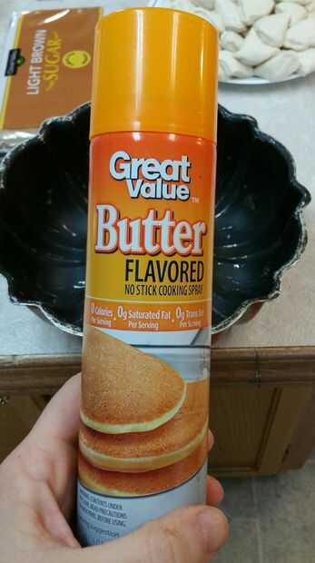 Engrasar un molde bundt con mantequilla o spray antiadherente. Usé el Pam genérico, así que quitar la tapa, apunte la boquilla en la cacerola de bundt y presione hacia abajo. El puede rociará un chorro de cosas con sabor a mantequilla, mueva la lata hasta que el utensilio esté tapado.