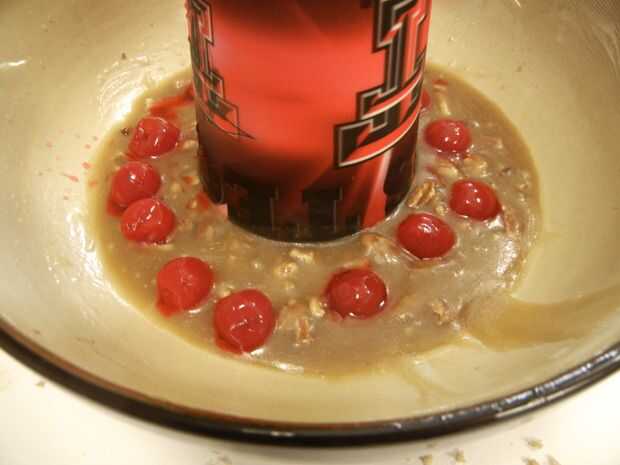 Colocar cerezas uniformemente alrededor de la taza. Trate de no obtener demasiado jugo en la mezcla, coloca las cerezas.