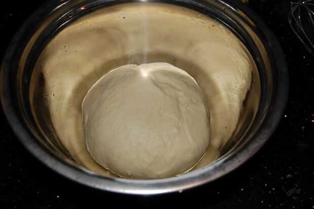 3. Amasar la masa en forma de bola. Toma un recipiente grande y grasa con aceite.  Coloque la masa en un tazón engrasado y cúbrala con una toalla húmeda.
