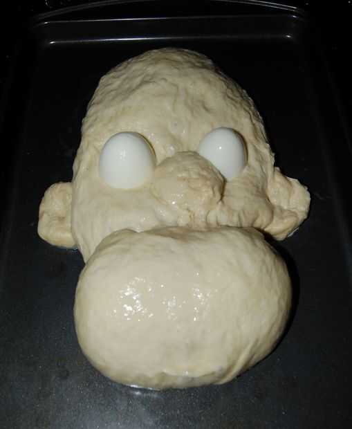 1. Tomar los dos huevos duros y colocar como ojos (otra vez si iba a hacer esto otra vez probablemente saltarse este paso y simplemente use bolas de masa como los huevos que terminó por ser "tragado" en la cabeza - Doh!)