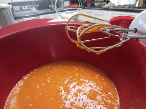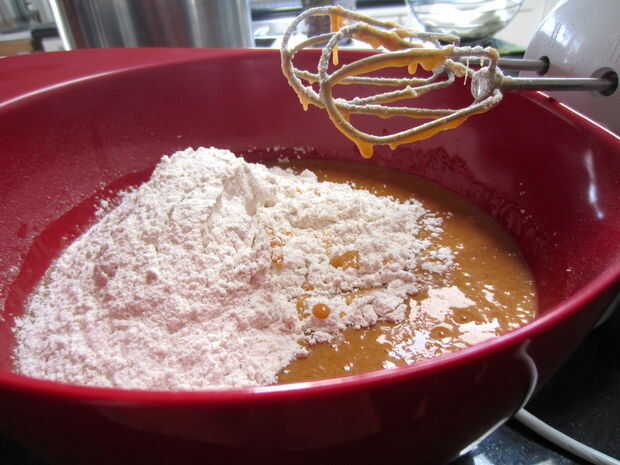 Mezcle la pulpa de caqui, azúcar, aceite, aguardiente y huevos en un tazón grande. Cierna los ingredientes secos y agregarlos a la mezcla de caqui.