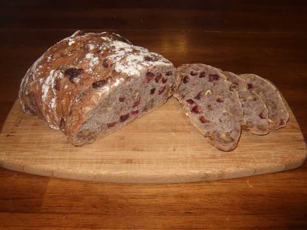 La receta original vino de un amigo que tenía desde los tiempos de Nueva York. He añadido la nueces, arándanos y trigo durante los años y simplificó el procedimiento en la parte superior. El tiempo de trabajo total se extiende unos 20 min por más de 20 horas.