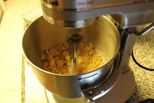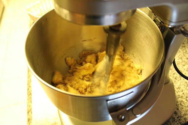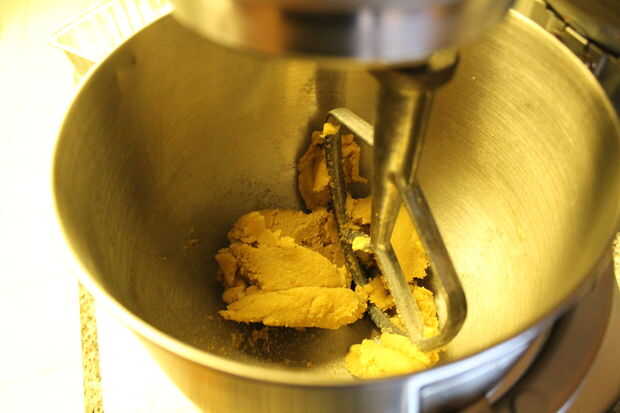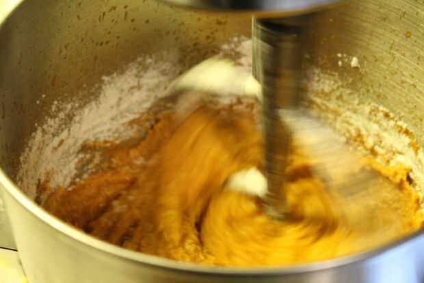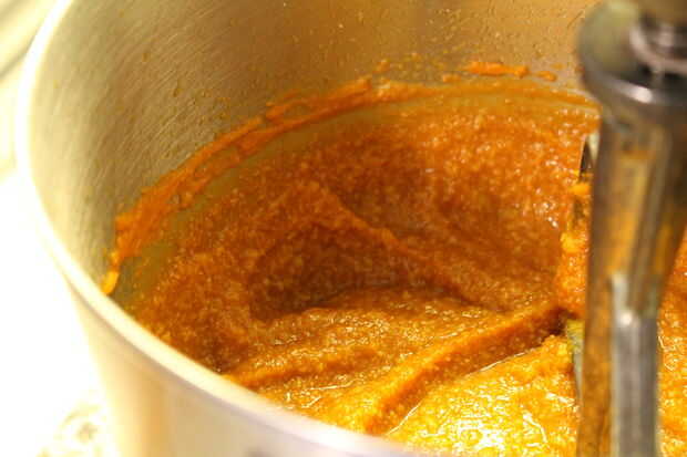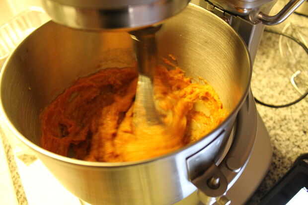 Crema a la mantequilla y el azúcar. Agregue la calabaza y los huevos y mezcle bien.