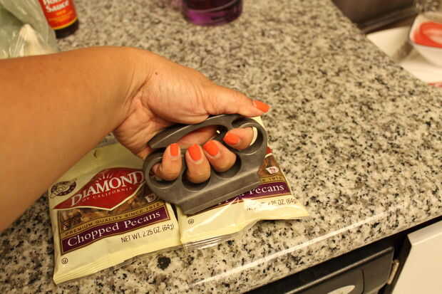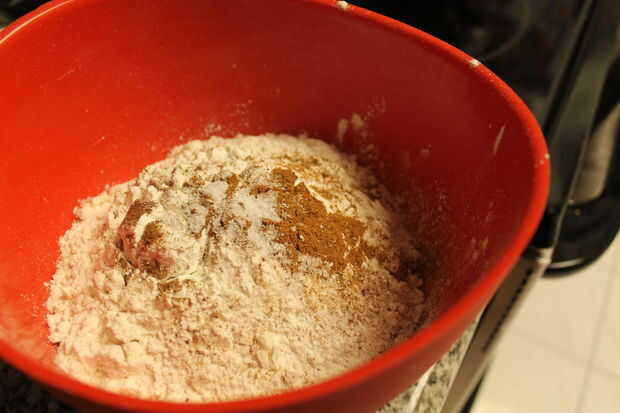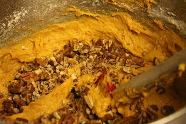 En otro tazón, combine todos los ingredientes secos excepto las tuercas. Mezclar 3 tazas de ingredientes secos a los ingredientes húmedos, luego agregue tanto de la 4 º Copa como sea necesario hasta lograr la consistencia adecuada (húmedo, pero lo suficientemente espesa para una cuchara). Añadir las nueces y revolver.