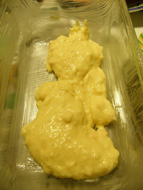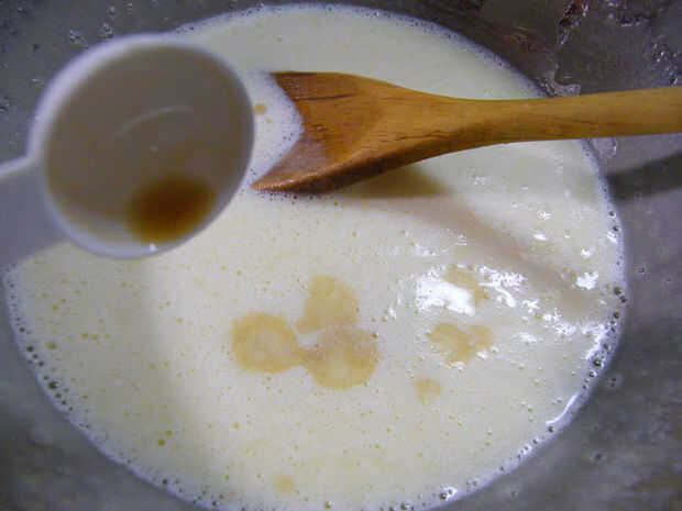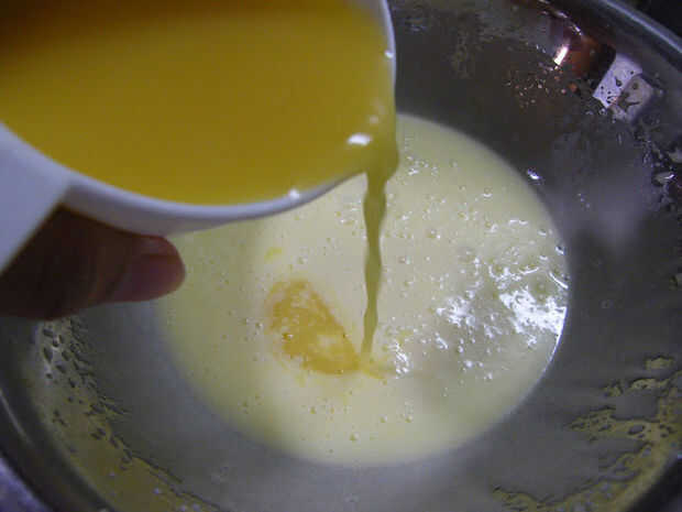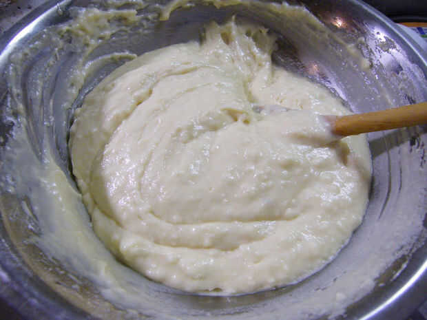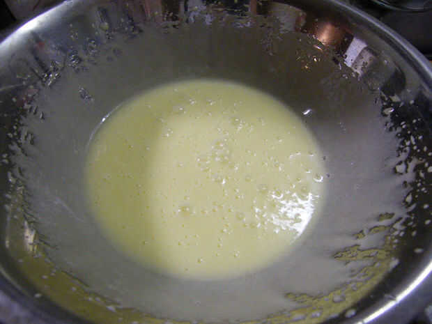 Batir los ingredientes bien mojados luego vierten en el jugo, revolver con cuchara de madera.