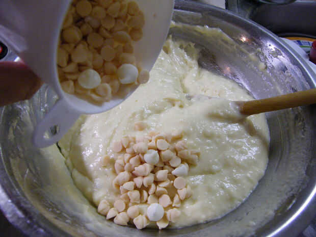 Mezcla los ingredientes bien secos luego agregar en trocitos de chocolate blanco, revolver a la capa