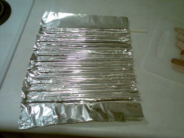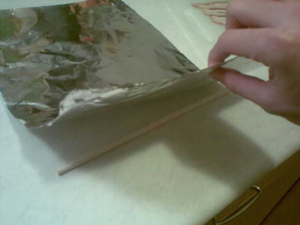 Para crear los bordes, coloque un objeto largo y estrecho como un lápiz de la pluma destapada (utilicé un palillo de la tajada), debajo de la lámina, de aproximadamente 3 pulgadas de un extremo. Luego presione la lámina, sobre la herramienta de elección. Esto producirá la primera cresta.