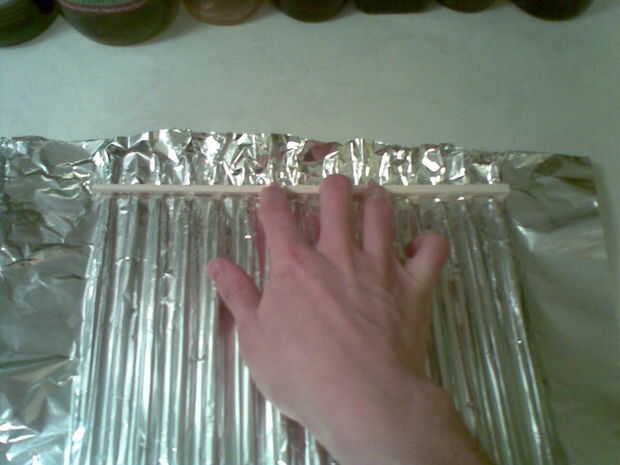 Después de los cantos se han hecho, presione la herramienta de elección, perpendicular a las crestas, aproximadamente 1 pulgada lejos del borde de láminas. Esto aplaste las crestas y le permitirá doblar la hoja para producir lo que se convertirá en una de las paredes de la cacerola.