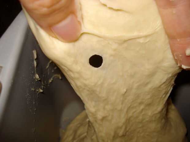 Para probar la masa para ver si ha sido amasado bien, suavemente estirar una porción de masa.  Si se rompe con un agujero redondo y limpio, está listo para el siguiente paso: impermeabilización.