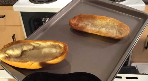 Aunque este paso no es 100% necesario, creo que es una buena idea para tostar las mitades de pan para hacerlos un poco más resistente al agua. En mi experiencia, salsa para pizza empapa en pan de pizza y es blanda.