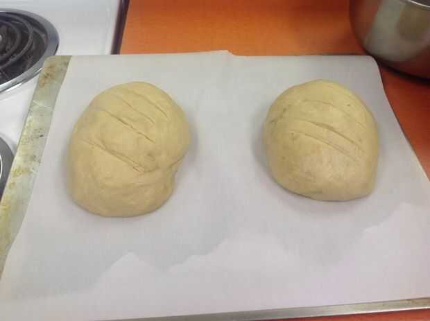 Dividir la masa por la mitad; forma de cada uno en un pan redondo. Coloque en una bandeja de hornear engrasada; Corte ranuras en tapas. Cubra y deje reposar hasta que doble, por noche.