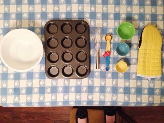1. tazón de fuente (para mezclar) de tamaño mediano 2. lata panecillo (que rinde 12 muffins) 3. bate 4. cuchara (1 cucharadita) de medición 5. probetas graduadas (1 taza, 2/3 taza y 1/3 de taza) 6. guante 7. el horno 8. papel toalla