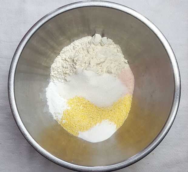 Colocar la harina de maíz, harina, azúcar, polvo de hornear, bicarbonato de sodio y la sal en un recipiente grande y bata para combinar.
