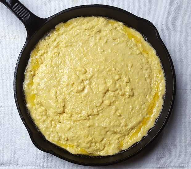 Vierta la mezcla en la sartén caliente y cueza al horno hasta marrón de oro y un cuchillo insertado en el centro, éste salga limpio, unos 15 minutos.