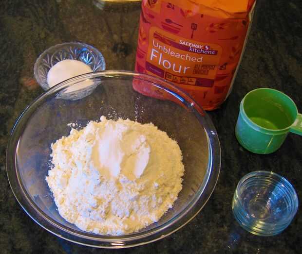 2. Mida y añada el polvo de hornear y bicarbonato de sodio en el recipiente con la harina.
