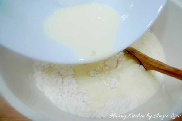 Paso 14: Vierta la mezcla de huevo y suero de leche mojado todo de una vez la mezcla de harina seca.