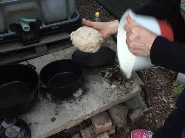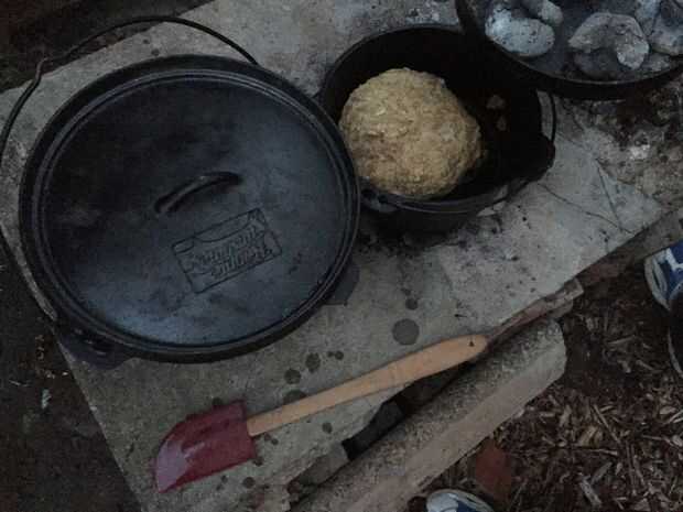 Precalienta la olla en las brasas hasta buena y caliente. Untar el fondo con aceite de cocina. Caída en la masa, cubrir con la tapa y carbones del montón en la parte superior. Cocer durante al menos media hora, tal vez 45 minutos, hasta levantado y firme al tacto. Sólo tienes que mantener control.