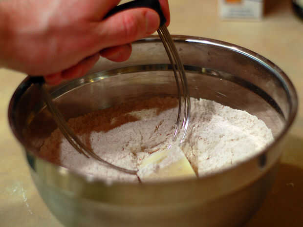 Después de dejar un poco la mantequilla caliente, corte a los ingredientes secos hasta que las piezas son ligeramente menores que guisantes. Prefiero usar una batidora de repostería, pero puede utilizar tenedores, dos cuchillos, o lo que quiera.